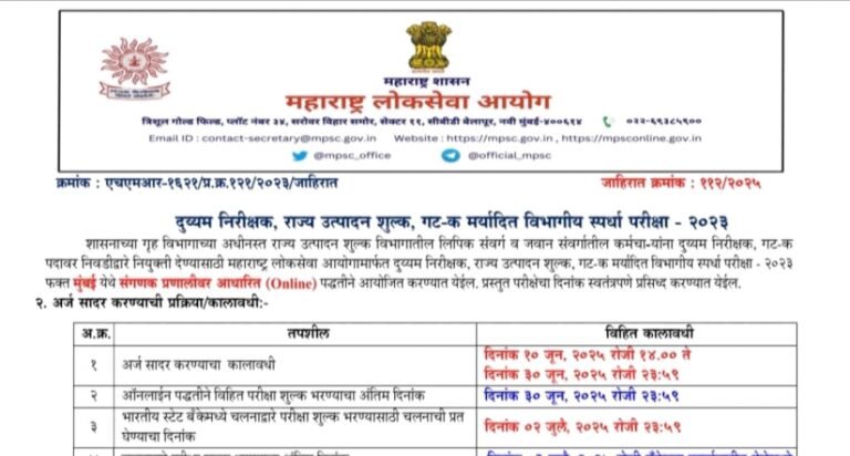 नवीन : महाराष्ट्र लोकसेवा आयोग भरती 2025 | राज्य उत्पादन शुल्क विभागांत भरती | MPSC BHARTI 2025